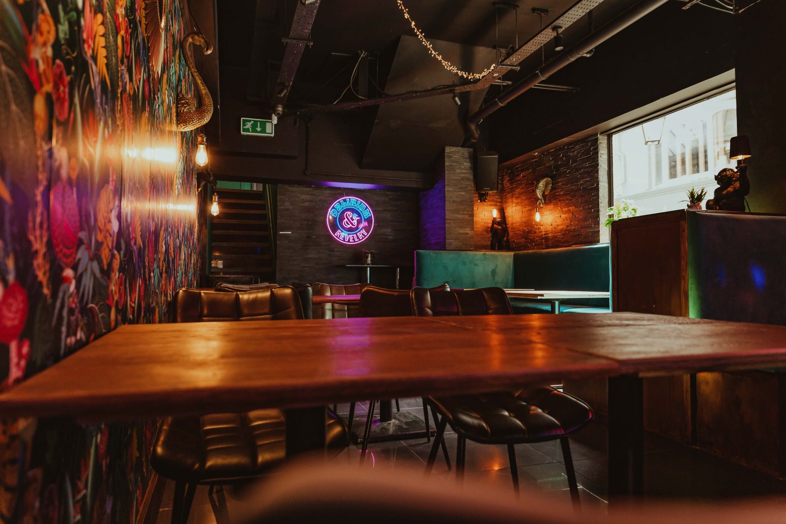 Delirium & Revelry, in the site of the former Hardey’s wine bar, has been fitted out with a jungle theme, with animal light fittings, suede booths in a shade of turquoise and upcycled furniture.