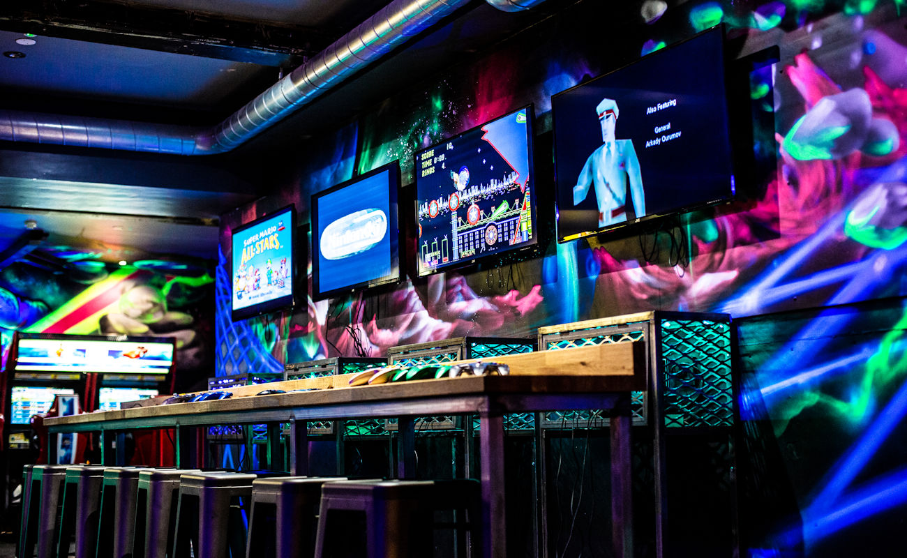 Enjoy the perfect combo of sipping on game-themed cocktails or craft beers, whilst button bashing to victory against your mates.